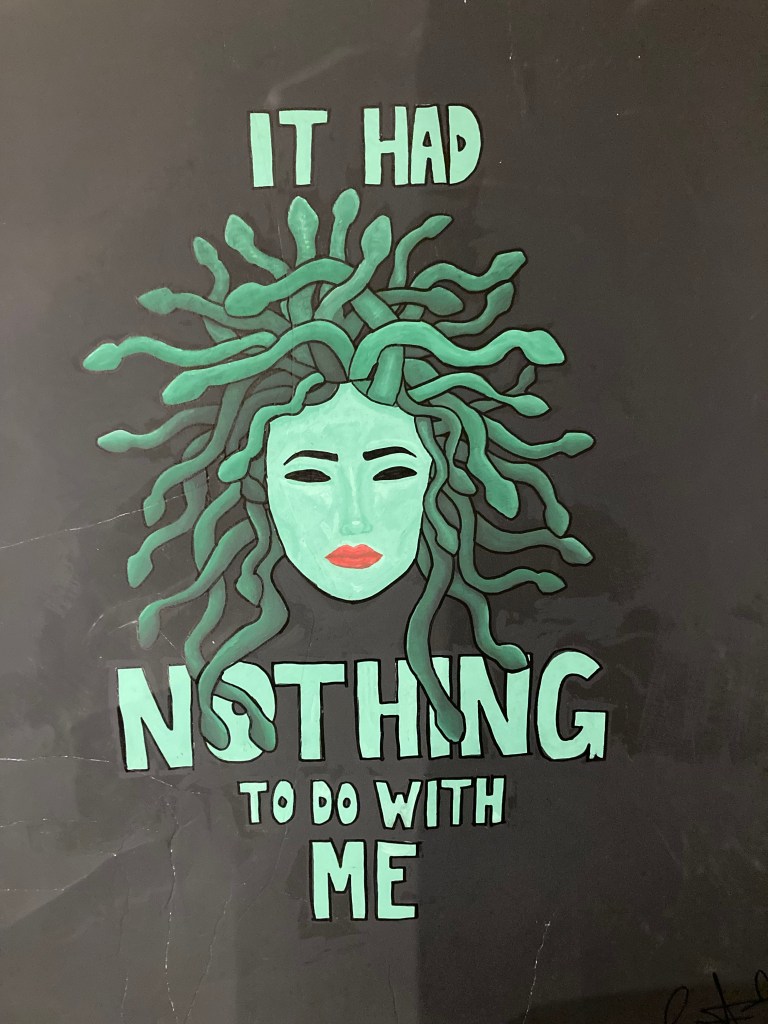 I started this piece on the first anniversary of one of my assaults. My best friend and I got massive poster boards to do art on. I started by writing letters to each of my rapists, read them to my friend, and then painted the whole thing black. I did this to let go of some of the resentments and anger I had and start fresh. The story of Medusa always meant a lot to me, especially after the things I experienced.